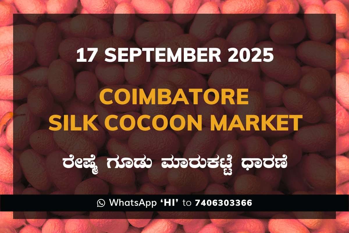 HomeTamil NaduCoimbatoreCoimbatore Silk Cocoon Market: 17 September 2025 Coimbatore Silk Cocoon Market: 17 September 2025 Coimbatore September 17, 2025 Updated: September 17, 2025 By administrator Share FacebookTwitterPinterestWhatsApp - Advertisement - - Advertisement - Coimbatore Government Silk Cocoon Market Daily Rate Report Date: 17/09/2025 Bi-Voltine Silk Cocoon – ದ್ವಿತಳಿ ರೇಷ್ಮೆ ಗೂಡು Qty: KgMx : ₹ 695Mn: ₹ 695Avg: ₹ 695 For Daily Updates WhatsApp ‘HI’ to 7406303366 Join WhatsApp Like this:Like Loading... Related - Advertisement - TagsCoimbatoreMarketSilkSilk Cocoon Market Share FacebookTwitterPinterestWhatsApp Latest news Channapatna Channapatna Silk Cocoon Market: 06 October 2025 administrator - October 6, 2025 - Advertisement - Malavalli Malavalli Silk Cocoon Market: 06 October 2025 administrator - October 6, 2025 Kanakapura Kanakapura Silk Cocoon Market: 06 October 2025 administrator - October 6, 2025 Ramanagara Ramanagara Silk Cocoon Market: 06 October 2025 administrator - October 6, 2025 Kolar Kolar Silk Cocoon Market: 05 October 2025 administrator - October 5, 2025 Hindupur Hindupur Silk Cocoon Market: 05 October 2025 administrator - October 5, 2025 Malavalli Malavalli Silk Cocoon Market: 05 October 2025 administrator - October 5, 2025 Related news Channapatna Channapatna Silk Cocoon Market: 06 October 2025 administrator - October 6, 2025 Malavalli Malavalli Silk Cocoon Market: 06 October 2025 administrator - October 6, 2025 Kanakapura Kanakapura Silk Cocoon Market: 06 October 2025 administrator - October 6, 2025 Ramanagara Ramanagara Silk Cocoon Market: 06 October 2025 administrator - October 6, 2025 Kolar Kolar Silk Cocoon Market: 05 October 2025 administrator - October 5, 2025 Hindupur Hindupur Silk Cocoon Market: 05 October 2025 administrator - October 5, 2025 Malavalli Malavalli Silk Cocoon Market: 05 October 2025 administrator - October 5, 2025 Kanakapura Kanakapura Silk Cocoon Market: 05 October 2025 administrator - October 5, 2025 - Advertisement - LEAVE A REPLY Cancel reply Comment: Please enter your comment! Name:* Please enter your name here Email:* You have entered an incorrect email address! Please enter your email address here Website: Captcha verification failed! CAPTCHA user score failed. Please contact us!