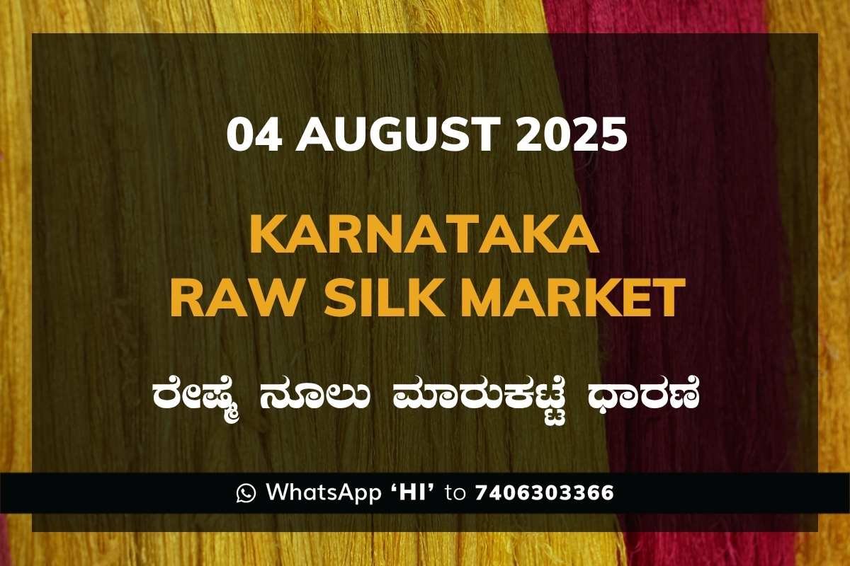 HomeSericultureRaw SilkKarnataka Raw Silk Exchange Price: 04 August 2025 Karnataka Raw Silk Exchange Price: 04 August 2025 Raw Silk August 5, 2025 Updated: August 5, 2025 By administrator Share FacebookTwitterPinterestWhatsApp - Advertisement - - Advertisement - Karnataka Raw Silk Yarn Exchange Market (Filature) Price ಕರ್ನಾಟಕ ರೇಷ್ಮೆ ನೂಲು ಮಾರುಕಟ್ಟೆ ಧಾರಣೆ Date: 04/08/2025 Filature Silk Max : ₹ 3800Min: ₹ 3500Avg: ₹ 3553 For Daily Updates WhatsApp ‘HI’ to 7406303366 Join WhatsApp Like this:Like Loading... Related - Advertisement - TagsMarketRaw SilkRaw Silk MarketSilk Share FacebookTwitterPinterestWhatsApp Latest news Malur Malur APMC Market: 08 October 2025 administrator - October 8, 2025 - Advertisement - Bagepalli Bagepalli (Bhagyanagara) APMC Market: 08 October 2025 administrator - October 8, 2025 Bangarapet Bangarapet APMC Market: 08 October 2025 administrator - October 8, 2025 Hindupur Hindupur Silk Cocoon Market: 08 October 2025 administrator - October 8, 2025 Channapatna Channapatna Silk Cocoon Market: 08 October 2025 administrator - October 8, 2025 Mysore Mysuru Silk Cocoon Market: 08 October 2025 administrator - October 8, 2025 Santemarahalli Santemarahalli Silk Cocoon Market: 08 October 2025 administrator - October 8, 2025 Related news Malur Malur APMC Market: 08 October 2025 administrator - October 8, 2025 Bagepalli Bagepalli (Bhagyanagara) APMC Market: 08 October 2025 administrator - October 8, 2025 Bangarapet Bangarapet APMC Market: 08 October 2025 administrator - October 8, 2025 Hindupur Hindupur Silk Cocoon Market: 08 October 2025 administrator - October 8, 2025 Channapatna Channapatna Silk Cocoon Market: 08 October 2025 administrator - October 8, 2025 Mysore Mysuru Silk Cocoon Market: 08 October 2025 administrator - October 8, 2025 Santemarahalli Santemarahalli Silk Cocoon Market: 08 October 2025 administrator - October 8, 2025 Malavalli Malavalli Silk Cocoon Market: 08 October 2025 administrator - October 8, 2025 - Advertisement - LEAVE A REPLY Cancel reply Comment: Please enter your comment! Name:* Please enter your name here Email:* You have entered an incorrect email address! Please enter your email address here Website: Captcha verification failed! CAPTCHA user score failed. Please contact us!